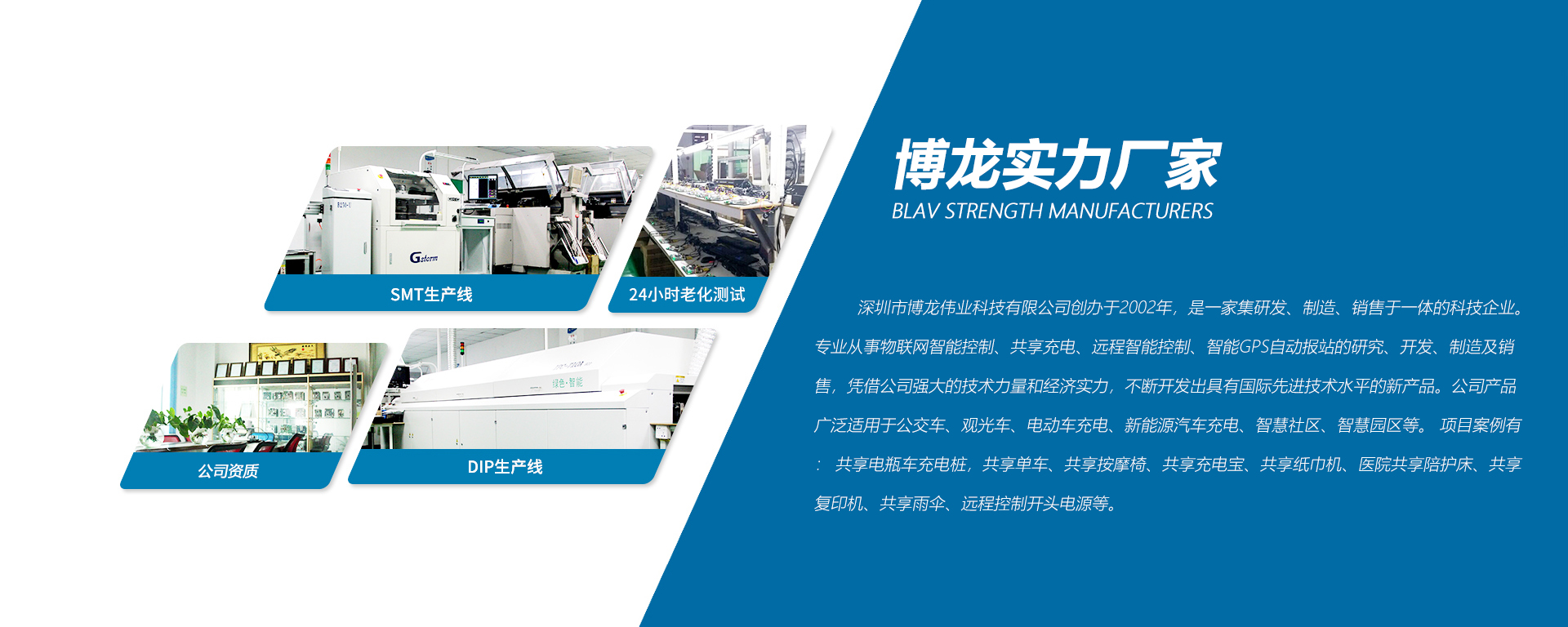 深圳市博龍偉業(yè)科技有限公司創(chuàng)辦于2002年,是一家集研發(fā)、制造、銷售于一體的科技企業(yè)。專業(yè)從事物聯(lián)網(wǎng)智能控制、共享充電、遠程智能控制、智能GPS自動報站的研究、開發(fā)、制造及銷售,憑借公司強大的技術力量和經濟實力,不斷開發(fā)出具有國際先進技術水平的新產品。公司產品廣泛適用于公交車、觀光車、電動車充電、新能源汽車充電、智慧社區(qū)、智慧園區(qū)等。 項目案例有: 共享電瓶車充電樁,共享單車、共享按摩椅、共享充電寶、共享紙巾機、醫(yī)院共享陪護床、共享復印 機、共享雨傘、遠程控制開頭電源等。